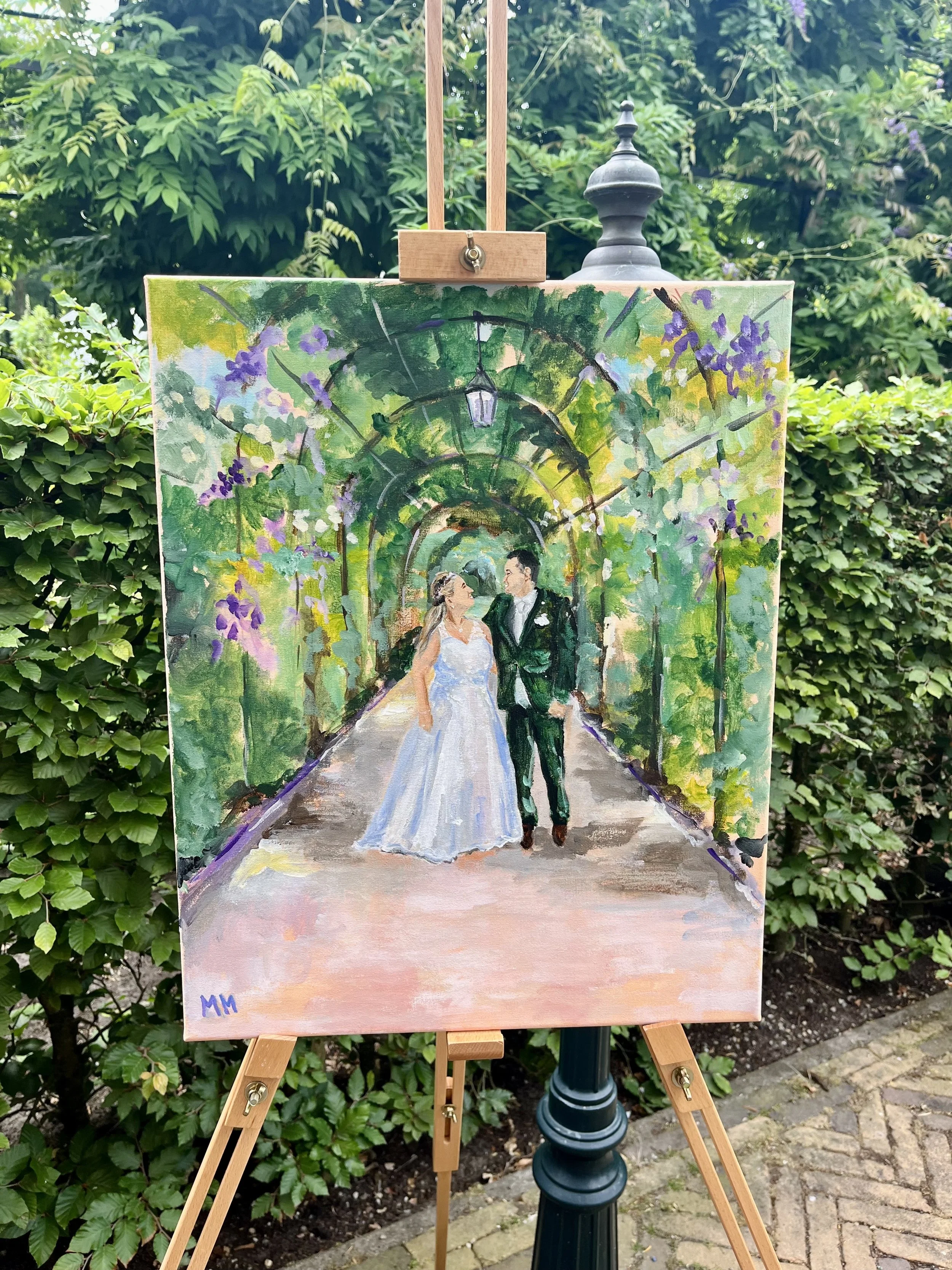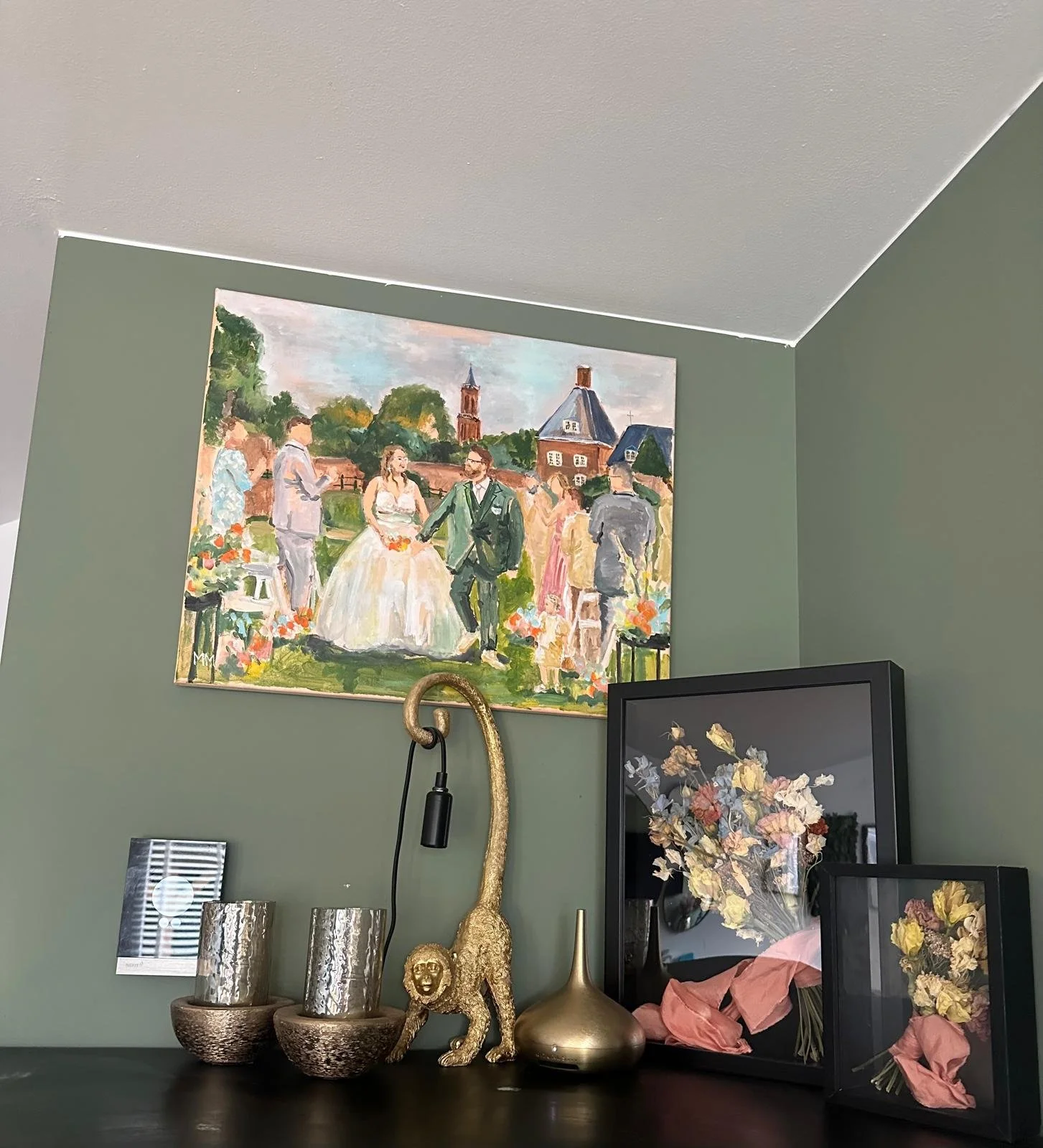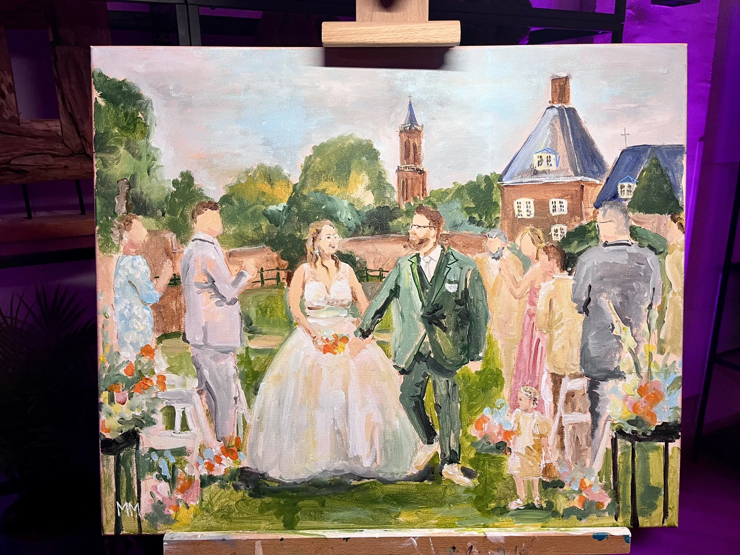 Afhankelijk van wat we afspreken, is het schilderij al op de dag zelf klaar of werk ik het in de weken daarna af. Daarna overhandig ik jullie het kunstwerk: een blijvende herinnering aan een fantastische dag.