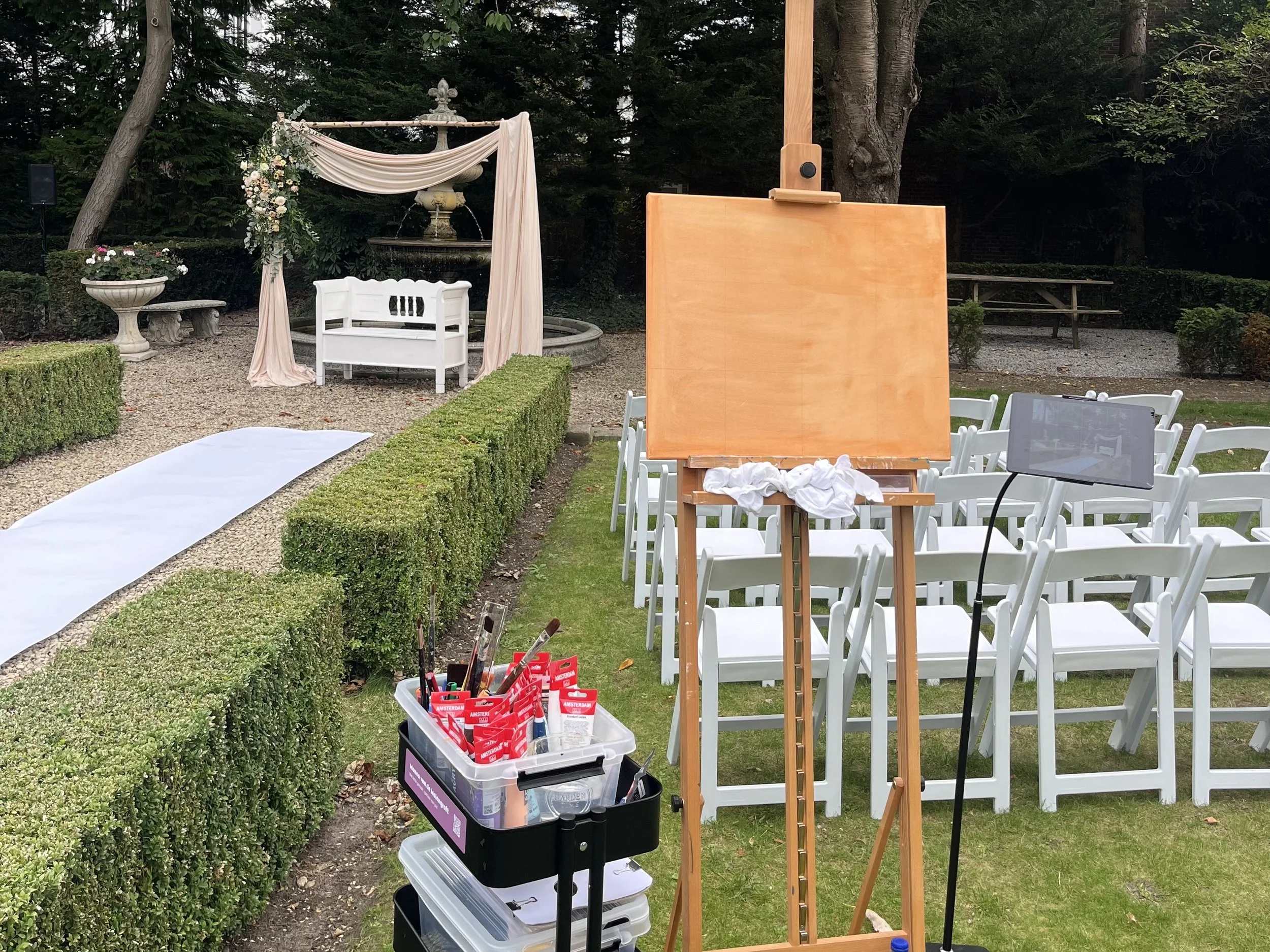 Op de dag van het event ben ik ruim op tijd aanwezig om mijn mini-atelier in te richten. Ik maak foto’s van het gekozen moment en schilder live te midden van alle gasten, een gezellige en bijzondere toevoeging aan de dag.